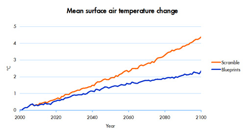In terms of temperature, the difference is a cause for concern. Whereas Blueprints shows clear signs of the temperature impact leveling out at somewhere between 2 and 3 degrees C, Scramble has us heading to 5 degrees C by the end of the century.