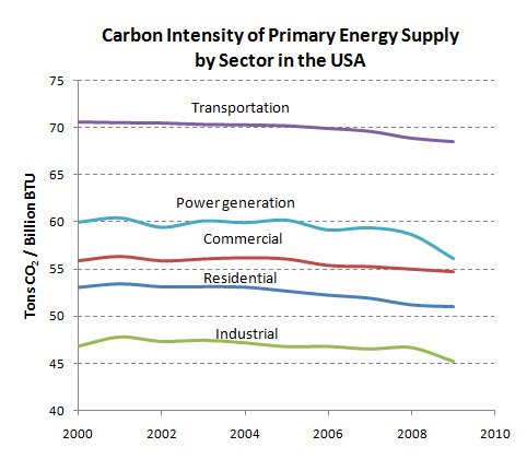 The fuel mix and associated carbon intensity of most sectors have tended to be very stable over time. However, in 2009, the carbon intensity of the electric power sector decreased by nearly 4.3 percent, primarily due to fuel switching as the price of coal rose 6.8 percent from 2008 to 2009 while the comparable price of natural gas fell 48 percent on a per Btu basis. The carbon content of natural gas is about 45 percent lower than the carbon content of coal and modern natural gas generation plants that can compete to supply base load electricity often use significantly less energy input to produce a kilowatt-hour of electricity than a typical coal-fired generation plant. For both of these reasons, increased use of natural gas in place of coal caused the sector’s carbon intensity to decrease.