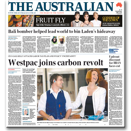 . . . . . the Newspoll, published in Wednesday’s The Australian newspaper, reveals 60 per cent of voters are opposed to the government’s plan to put a price on carbon next year, compared with 30 per cent who support it. Of the 60 per cent who are opposed to the tax, which Ms Gillard plans on introducing from July next year, 39 per cent of the poll’s participants said they are “strongly against” it. In comparison, of the 30 per cent who said they supported the carbon tax, only 12 per cent said they were “strongly in favour” of it.