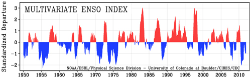 Back to David’s fascination with La Nina weather pattern. Obviously, ENSO is very significant oceanic phenomenon which affects global distribution of energy. Although the sea surface temperature and OHC has reliable measurement for only about 7 years (ARGO), we have indication of 60 years cycle in ENSO reconstructions.
