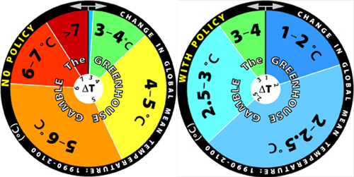 Meanwhile the scientists and economists at MIT, one of the USA’s premier universities frames the issue in terms of risk and uncertainty, rather than absolutes. Their Greenhouse Gamble wheels were developed by the Joint Program on the Science and Policy of Global Change to better convey uncertainty in climate change prediction. Their roulette-style spinning wheels depict the estimated probability, or likelihood, of potential temperature change (global average surface temperature) over the next 100 years, with policy implementation as the principle variable between the two. The policy framework necessary to move between the two is more substantive than that which we see today, but the path forward being taken by many nations is at least aligned with the required direction. This state of affairs is likely to persist for much of this decade, but is nevertheless still a critical capacity building phase for the future. Certainly if all nations moved forward with the types of efforts described above, the risk profile of the second wheel becomes achievable.