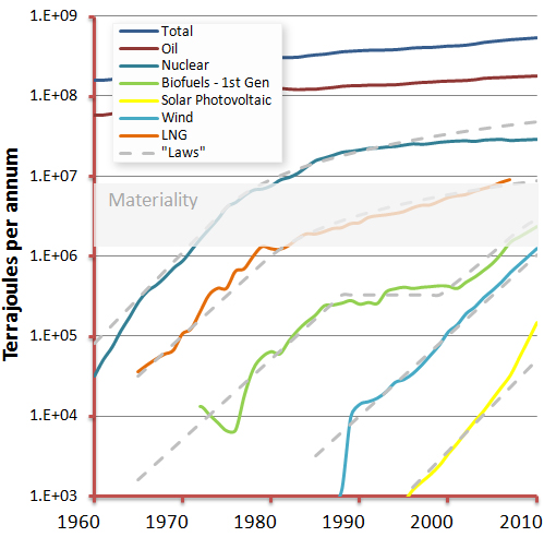 When technologies are new, they go through a few decades of exponential growth, which in the twentieth century was characterized by scale-up at a rate of one order of magnitude a decade (corresponding to 26% annual growth). Exponential growth proceeds until the energy source becomes ‘material’ — typically around 1% of world energy.