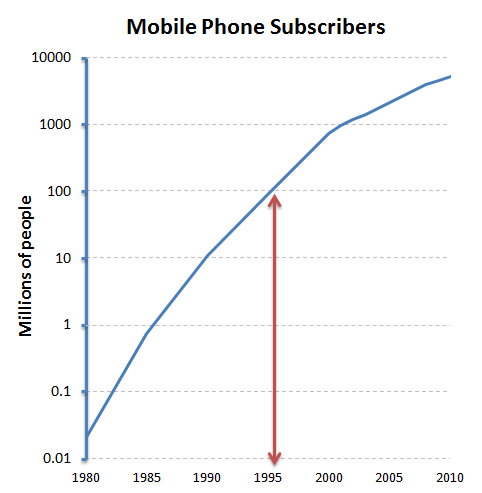 Unfortunately the deployment of “toy technology” also follows the “laws”, although the time scales are shortened somewhat. Although the first hand-held mobile phone call was made around 1975 and Finland had a 20,000 person subscriber trial up and running by 1980 (i.e. first adopter), it wasn’t until 1995 that the technology became “material”, reaching 1-2% of the global population. Today the global market is approaching saturation (6 billion subscriptions) although now the transition from mobile phone to mobile smart device is underway. So even in the world of fast paced technological change, materiality still takes 15 or so years and full scale deployment another 15-20 years.