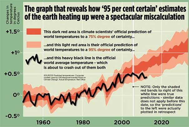 The Mail article uses a simple surface temperature chart to argue that warming estimates have been a “spectacular miscalculation”, even though the heavy black line shown in the chart (see below) has not actually breached the 95% confidence limits, rather there is just the assertion that it “is about to crash out”.