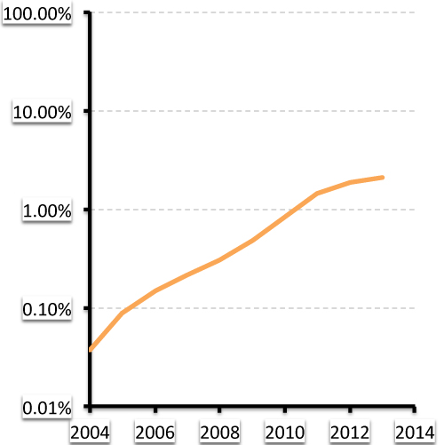 Even in Germany it is taking a while for solar to make a showing: While solar PV in Germany is having a profound impact on electricity generation on long sunny days in June, the annual story when looking at total energy use is different. Solar has reached about 2% of the mix (i.e. reached materiality) and might even be showing some signs of slowing up and growing at a more linear rate (but a few more years data are needed to see the real trend). Again, this is a log chart.
