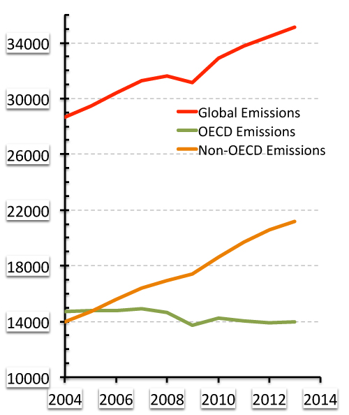 Global CO2 emissions just keep on rising: This is hardly a surprise, but given the recent burst of capacity from the renewable energy sector there might be some sign of some levelling off at least. OECD emissions are at least flat now, but non-OECD emissions continue to rise sharply as coal use increases in particular (chart below in millions tonnes CO2 per annum).