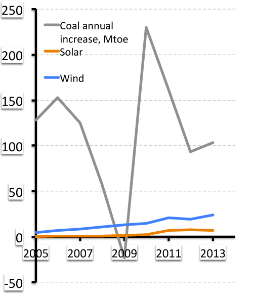 The annual increase in fossil fuel use far exceeds the increase in renewable energy production: While many will readily quote the annual increase in renewable energy investment or annual increase in renewable energy capacity as evidence of turning the corner, the reality in terms of renewable energy produced is somewhat different. The chart below compares the annual coal increase with global solar and wind increases. For reference, the total fossil fuel increase from 2012-2013 was 183 Mtoe (million tonnes oil equivalent). The whole picture is rather distorted by the global financial crisis, but coal alone is increasing by something like 100-150 Mtoe per annum. At least for the last couple of years solar has been flat at about 7 Mtoe annual increase.