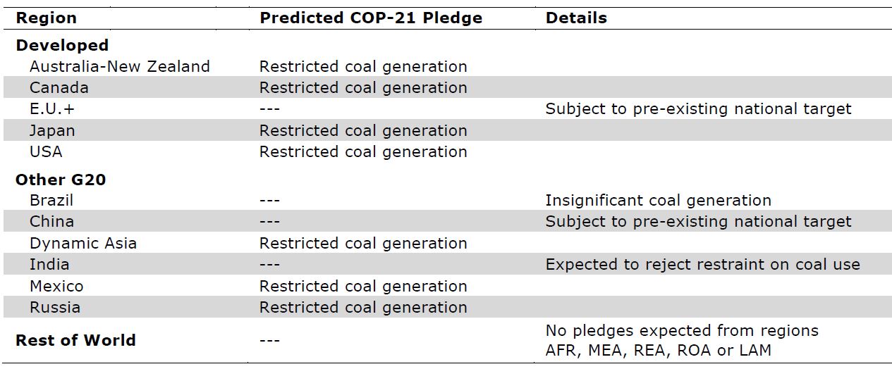 Electricity generation is the single largest emitting sector in most countries and therefore features first in the resulting analysis. The MIT team argue that the majority of policy effects on emissions can be covered with just two options: controls on coal-fired generation and renewable energy mandates. In the case of coal, various regions and countries are assumed to pledge restrictions in coal generation, as outlined in the table below. Crucially though, large future users such as India are not expected to make a pledge of this type.