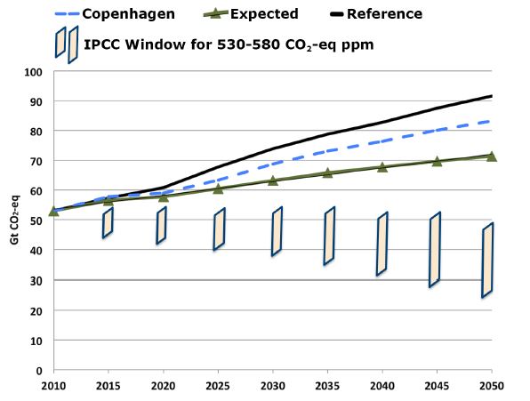 The effect of all this is noticeable, but growth in global emissions still continues through to 2050, although at a slower pace than the reference scenario. MIT have 2050 CO2-eq emissions at about 71 Gt, vs. their estimate of 56 Gt in the year of the agreement, i.e. 2015. This outcome is compared with two other projections in the figure below. One is the Reference case used throughout this analysis. Also shown, for comparison purposes, is their estimate of emissions to 2050 if commitments made in Copenhagen are met in 2020 and sustained thereafter. By this analysis, the expected contributions from current negotiations will bring the nations part way toward an RCP 4.5 pathway (a median global temperature increase of 1.8°C over this century or about 2.6°C above the pre-industrial level) but will also leave much to be done in subsequent efforts.