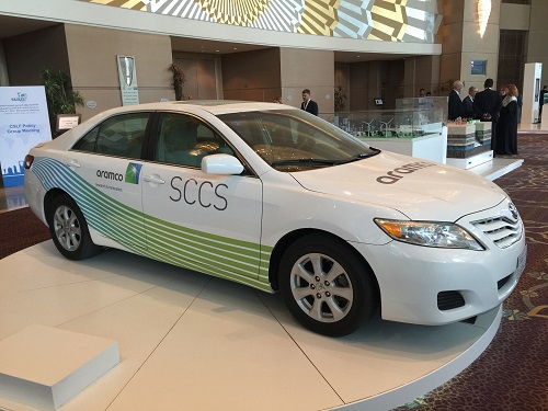 To this end, Saudi Aramco is doing some intriguing work on small scale carbon capture, which was demonstrated in both Riyadh and Dhahran by their display featuring a saloon car with on-board carbon capture. The vehicle captures about thirty percent of the carbon dioxide in the exhaust, using a solvent process. The CO2 is then recovered from the solvent, compressed and stored as a supercritical liquid in a small cylinder, all within the vehicle itself. The carbon dioxide can then be discharged when the car is filled with fuel as part of the normal service offered at a (future) gasoline station. The fuel supplier would then handle long term geological storage of the carbon dioxide or may have outlets where it can be profitably used (e.g. as a feedstock for manufacture of more fuel, but with the caveat that a considerable amount of energy will be required for such a step).